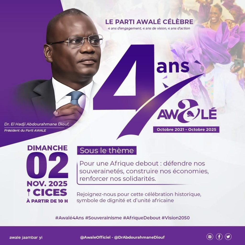 « Quatre ans d’AWALE, c’est quatre ans d’engagement pour la dignité, la justice et la souveraineté africaine », souligne un communiqué du mouvement, qui invite les citoyens à se joindre à cette célébration symbole d’un engagement collectif et d’une espérance partagée.