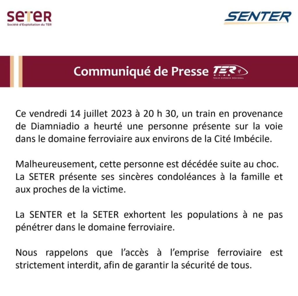 Le train express régional a enregistré son deuxième cas d’accident. Le drame est survenu ce vendredi 14 juillet 2023 à 20 h 30. « Un train en provenance de Diamniadio a heurté une personne présente sur la voie dans le domaine ferroviaire aux environs de la Cité Imbécile », informe le communiqué de SETER qui regrette le décès de la personne en question suite à ce choc.