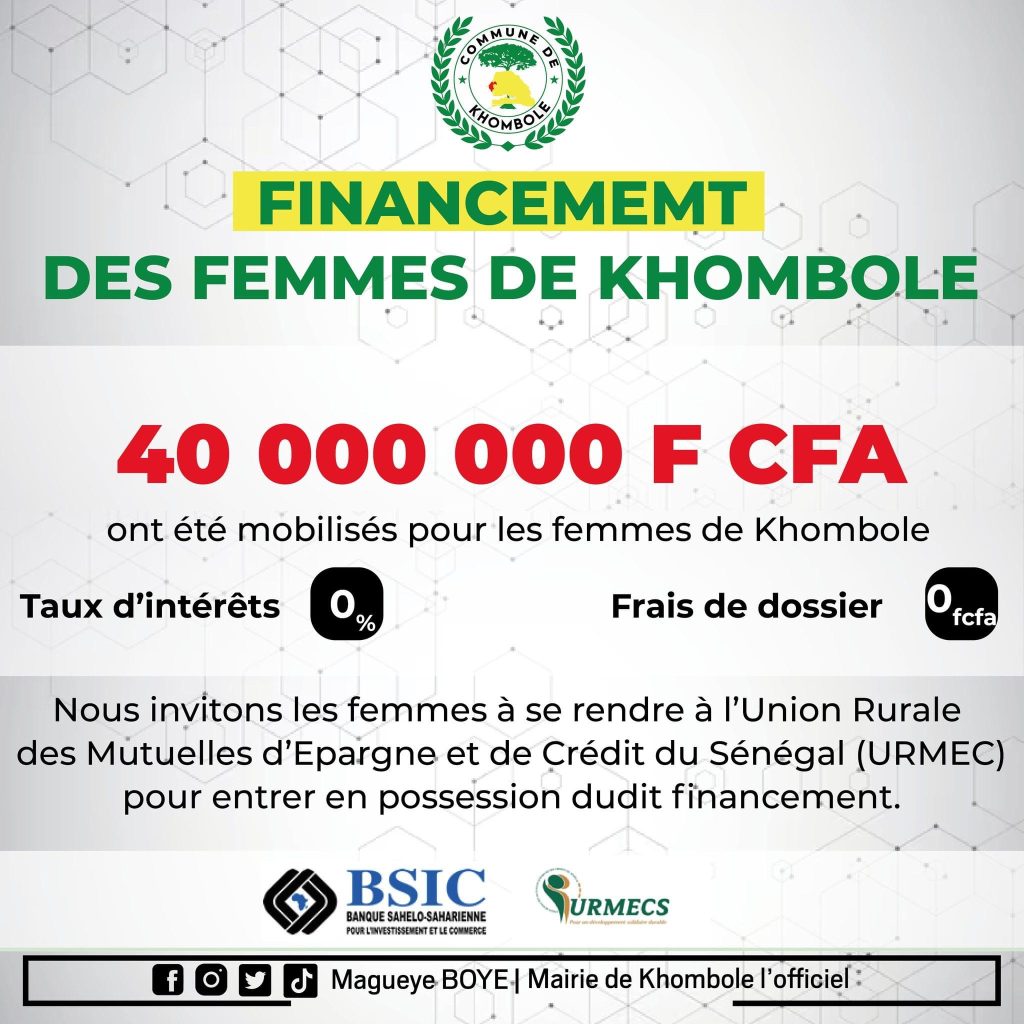 La Mairie a levé un financement en compagnie de la BSIC et de l’URMEC, pour un montant de 40 000 000 FCFA pour financer les projets des femmes de Khombole au taux d’intérêt de 00%.