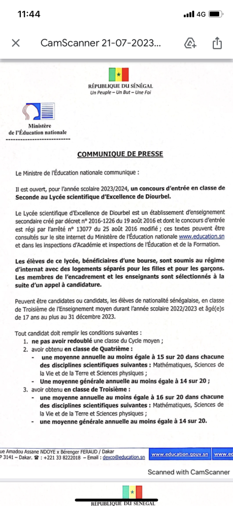 Il est ouvert, pour l’année scolaire 2023/2024, un concours d’entrée en classe de Seconde au Lycée scientifique d’Excellence de Diourbel.