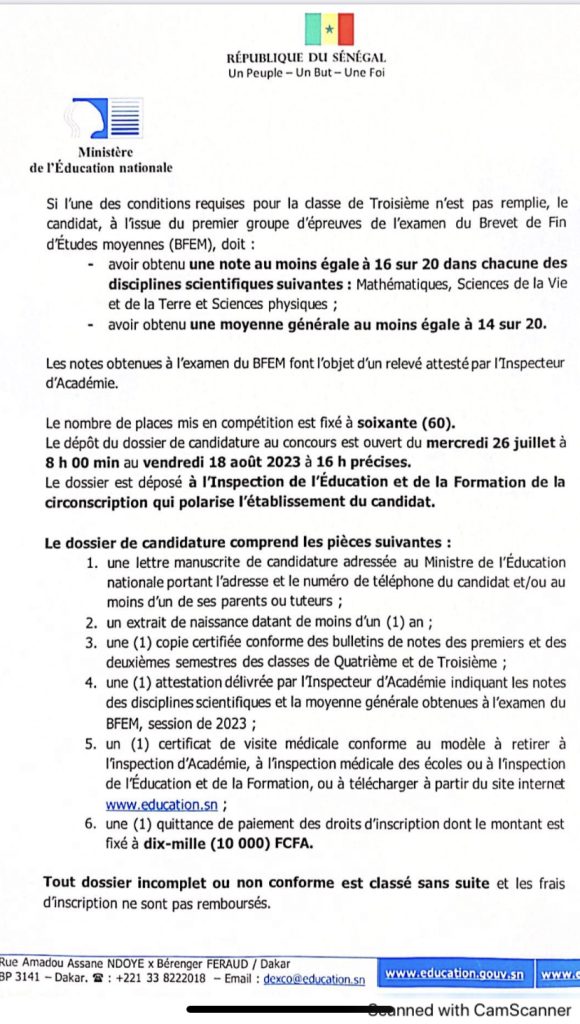 Peuvent être candidates ou candidats, les élèves de nationalité sénégalaise, en classe de Troisième de l’Enseignement moyen durant l’année scolaire 2022/2023 et âgé(e)s de 17 ans au plus au 31 décembre 2023.