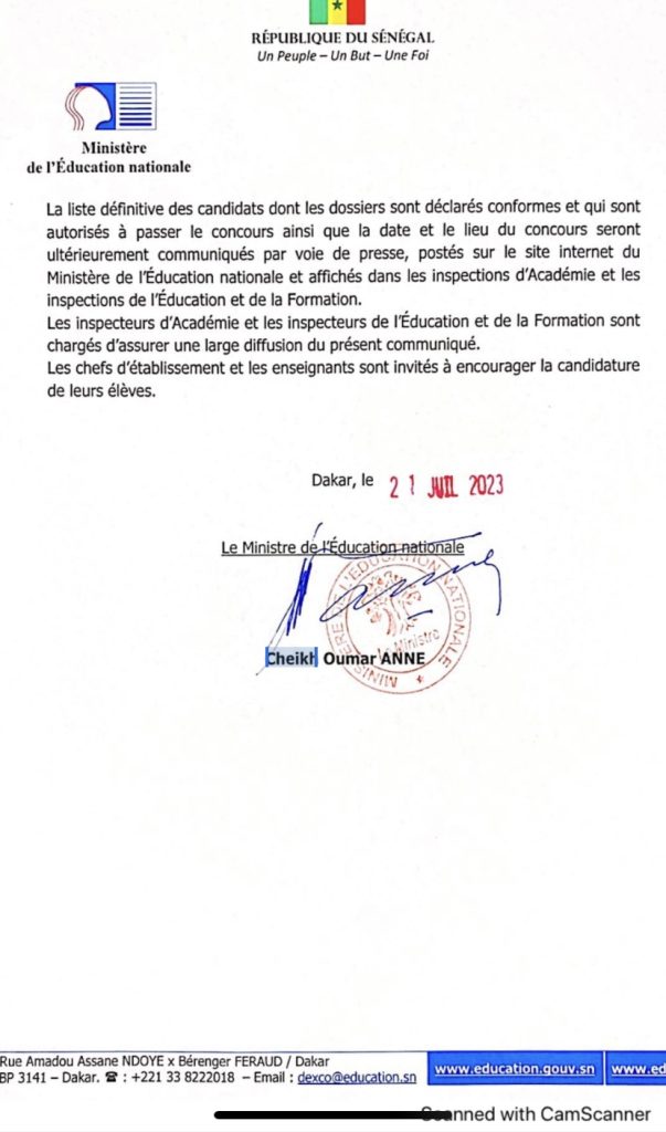 La liste définitive des candidats dont les dossiers sont déclarés conformes et qui sont autorisés à passer le concours ainsi que la date et le lieu du concours seront ultérieurement communiqués par voie de presse, postés sur le site internet du Ministère de l’Éducation nationale et affichés dans les inspections d’Académie et les inspections de l’Éducation et de la Formation.