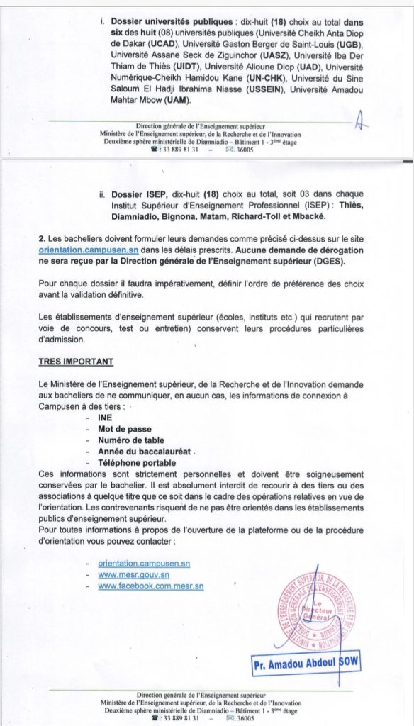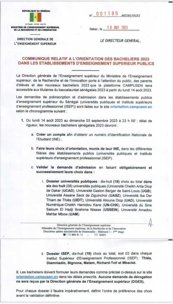 « La plate-forme Campus sera accessible aux titulaires du baccalauréat sénégalais à partir du Lundi 14 Août au Dimanche 03 Septembre 2023. Les demandes de pré-inscription et d’admission dans les établissements publics d’enseignement supérieur du Sénégal sont faites sur le site orientation.campusen.sn  » informe le communiqué par le directeur général l’enseignement supérieur.