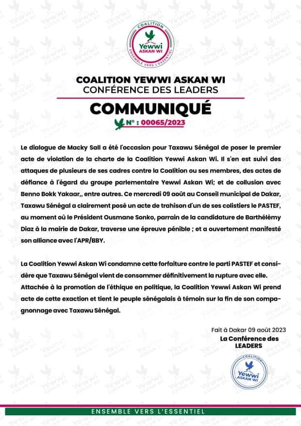 Compte tenu de ces considérations, Yewwi Askan Wi considère que Taxawu Sénégal vient de consommer définitivement la rupture avec elle. La coalition Yewwi Askan WI prend acte de cette exaction et tient le peuple sénégalais à témoin sur la fin de son compagnonnage avec Taxawu Sénégal