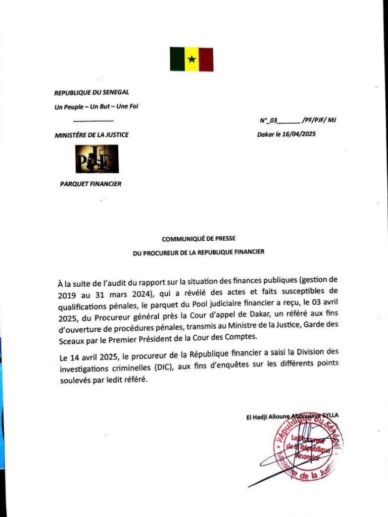 Selon un communiqué officiel du Procureur de la République financier, le parquet a été saisi le 03 avril dernier par le Procureur général près la Cour d’appel de Dakar, suite à un référé émis par le Premier Président de la Cour des Comptes. Ce dernier avait transmis le document au Ministre de la Justice, Garde des Sceaux, conformément à la procédure en vigueur.