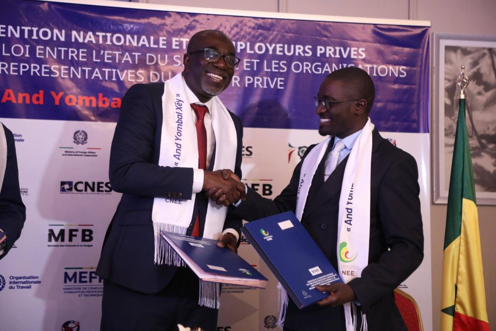 Placée sous la présidence effective de M. Moustapha Ndieck SARRE, ministre de l’Emploi et de la Formation professionnelle et technique, la rencontre a réuni également M. Cheikh DIBA, ministre des Finances et du Budget, ainsi que M. Olivier BOUCAL, ministre de la Fonction publique, du Travail et de la Réforme du service public. Les représentants des principales organisations patronales, notamment le CNP, la CNES, le MDES et l’UNACOIS, ont également pris part à cette étape majeure.