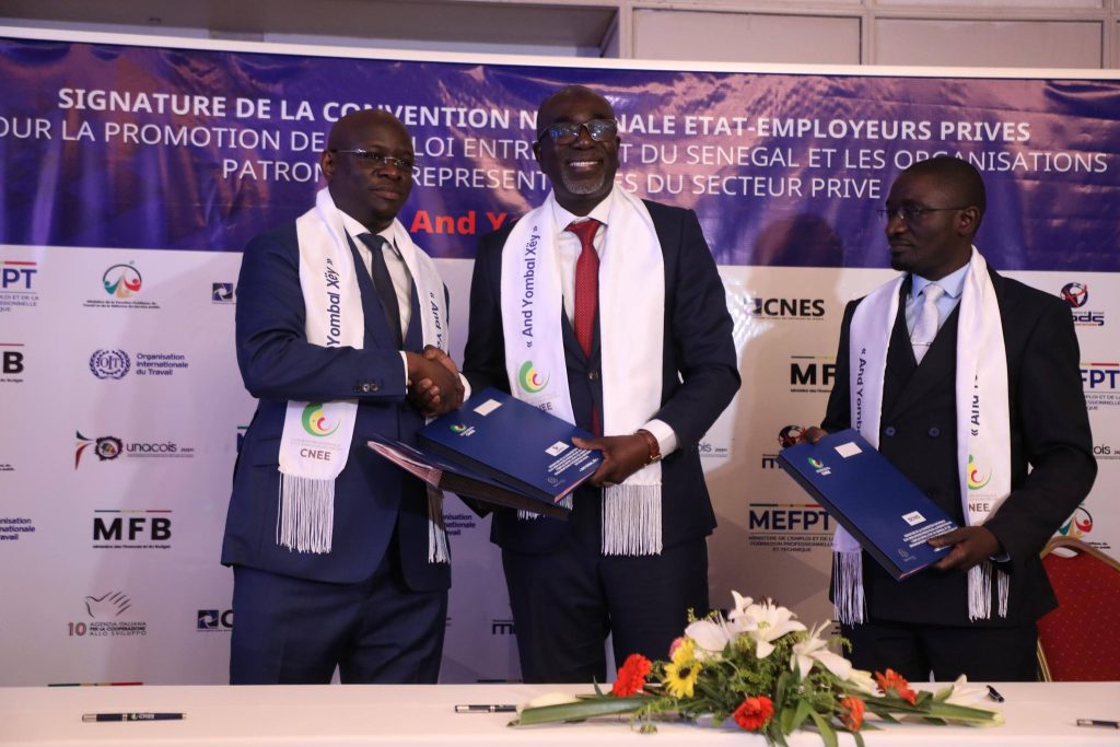 Ce jeudi 23 avril 2026, l’État du Sénégal et les principales organisations patronales du secteur privé ont officiellement procédé à la signature de la nouvelle Convention nationale État–Employeurs privés pour la promotion de l’emploi, baptisée « And Yombal Xëy ». La cérémonie s’est tenue à Dakar, à l’Hôtel King Fahd Palace, en présence de plusieurs membres du gouvernement et de partenaires techniques et financiers.