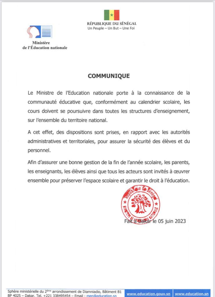 « Les cours doivent se poursuivre dans toutes les structures d’enseignement, sur l’ensemble du territoire national », a indiqué Cheikh Oumar Anne dans un communiqué.