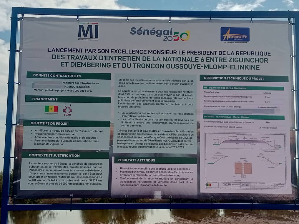 Le Président de la République a indiqué que 10 milliards de francs CFA ont été mobilisés pour cette première phase. Cette enveloppe permettra à la fois l’exécution des travaux d’urgence et la réalisation d’études techniques et financières, destinées à évaluer la soutenabilité budgétaire d’une réhabilitation complète de la route. Par ailleurs, des études parallèles seront menées en collaboration avec l’AGEROUTE, en vue d’examiner la construction éventuelle d’une autoroute sur cet axe, appelé à connaître un trafic croissant, notamment avec la mise en œuvre de nombreux projets structurants en Casamance.