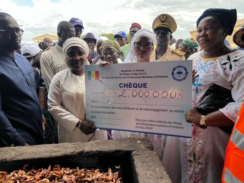 Premier arrêt : le site de transformation de Boudody, tristement célèbre depuis l’incendie qui a ravagé une grande partie du matériel des femmes transformatrices de poisson. Sur place, la ministre a exprimé toute sa solidarité aux victimes. « Je suis venue d’abord leur témoigner un soutien moral, mais également leur apporter un appui matériel conséquent », a-t-elle déclaré. Ce soutien est constitué d’un lot d’équipements d’une valeur de 25 millions de francs CFA, comprenant entre autres des bagues, du matériel de pesage, des coffres, des glacières et des gants.